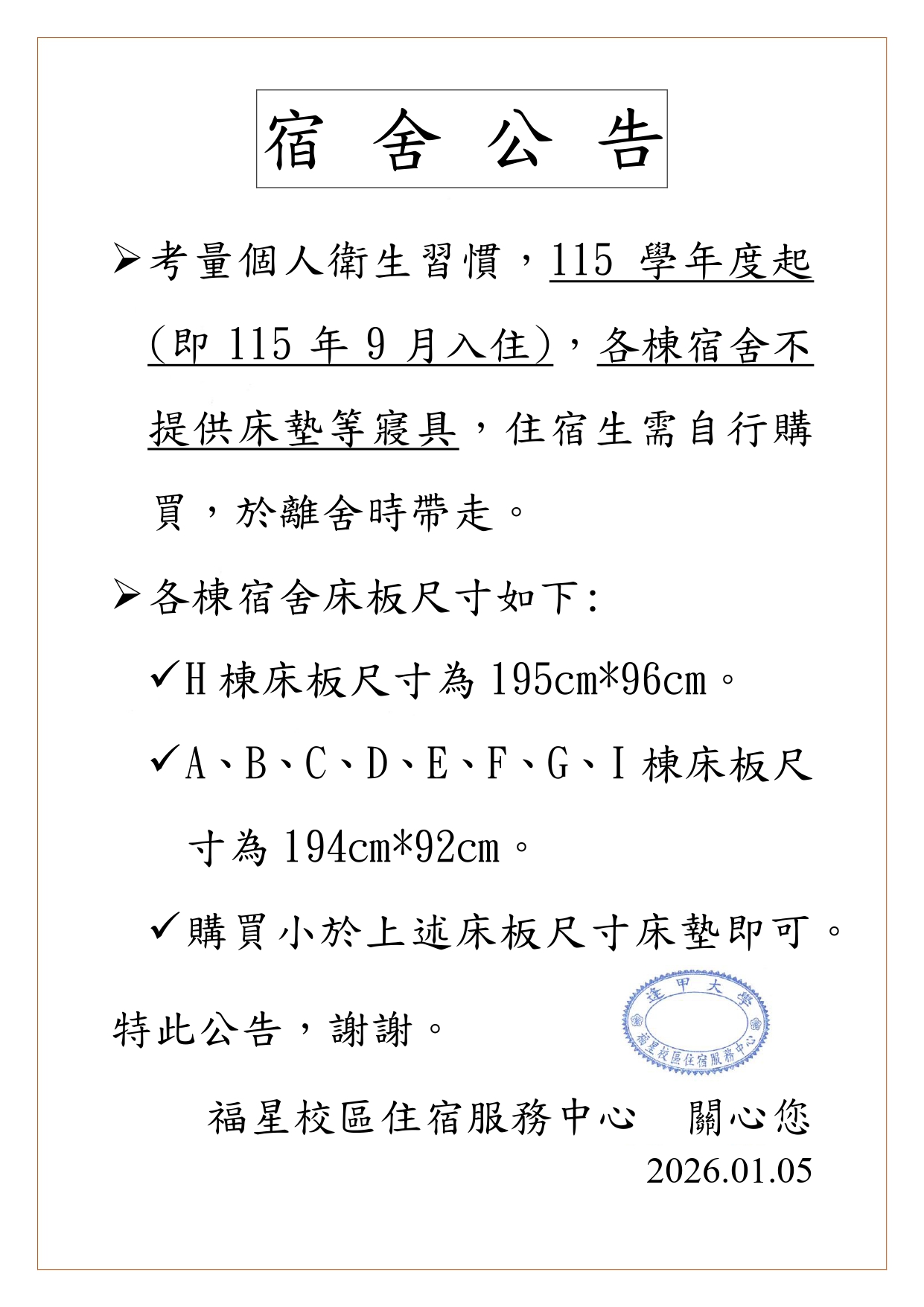 請注意:115學年度起福星校區各棟宿舍不提供床墊等寢具/Starting from the 2026 academic year, mattresses and other bedding will not be provided in any dormitory buildings.